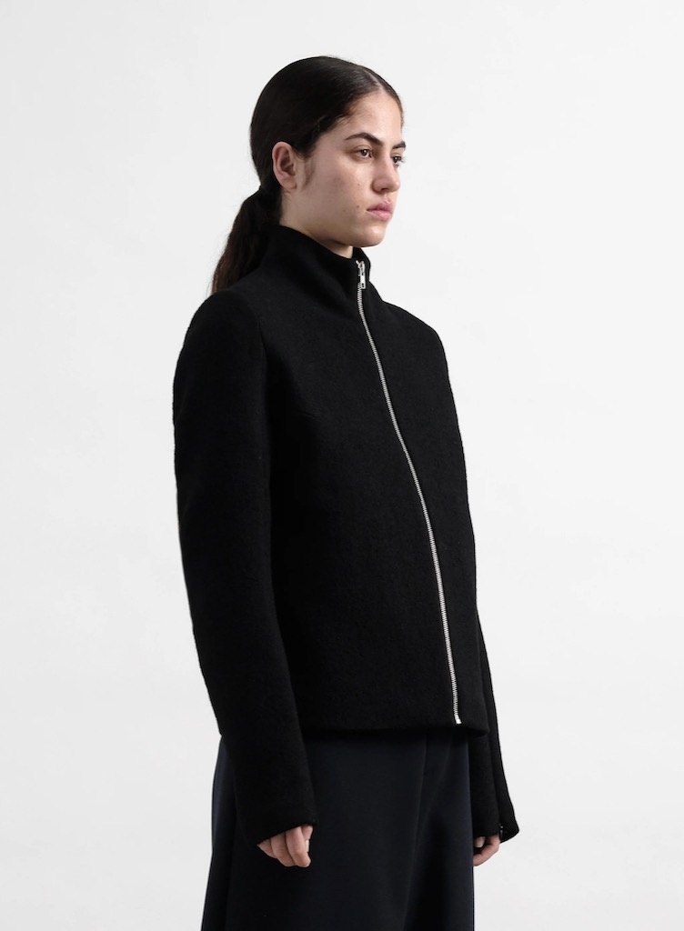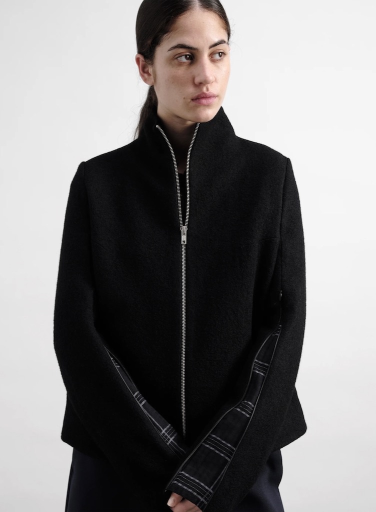 You Must CreateBjork zip jack zw €525,00 Incl. btwSize: *SMLNiet op voorraadGratis verzending Vanaf €150,-Beschrijving+ Zip-up slim fit jacket + Gusset zip detail with contrast inserts + Funnel neck + Shaping darts on chest + Two way YKK zip fastening + Half lined body and fully lined sleeves + 100% Virgin Wool, Lining 100% Viscose, Trim 100% Organic Cotton