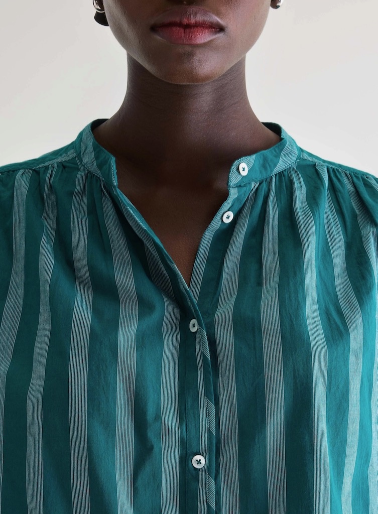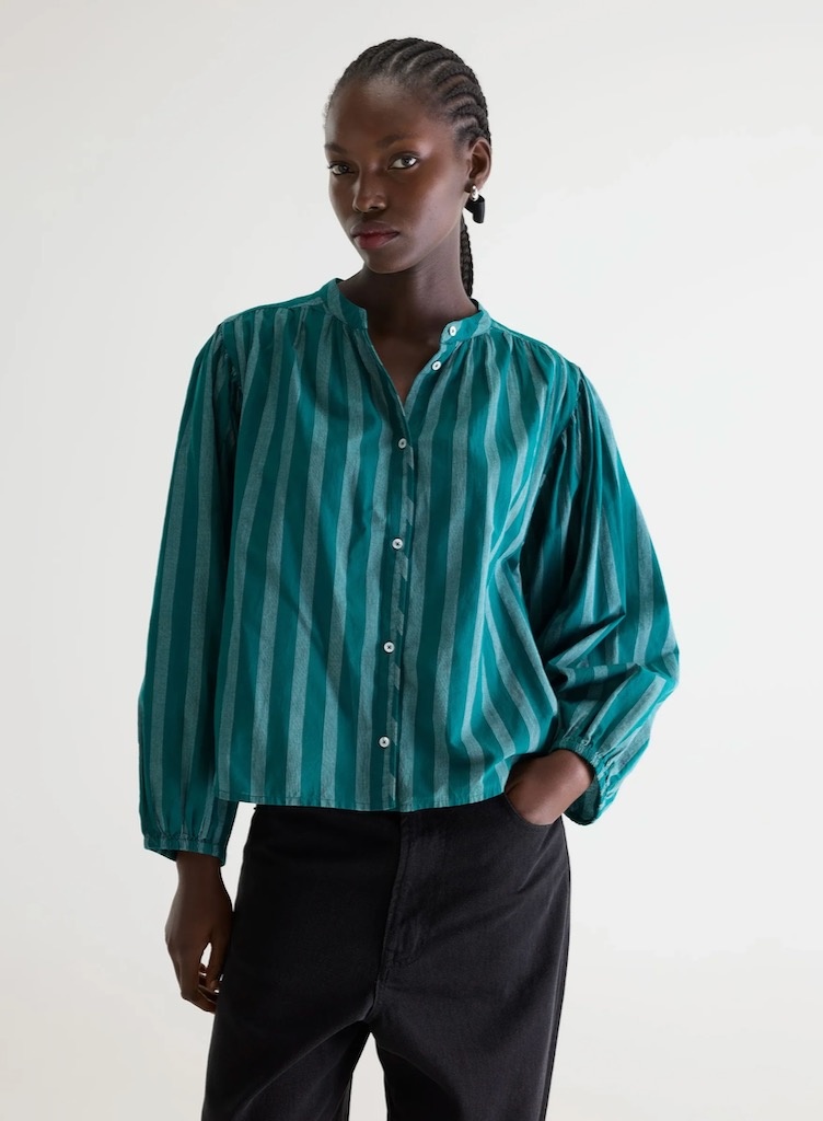 BelleroseCherry blouse stripe A €149,00 Incl. btwSize: *SMLXLToevoegen aan winkelwagenGratis verzending Vanaf €150,-Beschrijving+ Relaxed, boxy fit + Mao collar + Button-down front + Long puffed sleeves + Elasticated cuffs + Gathered shoulders + Emerald green with light stripes + 100% Lightweight cotton