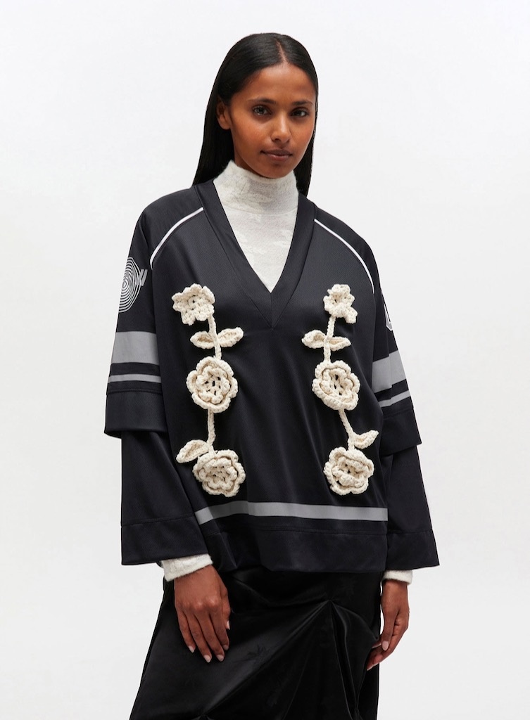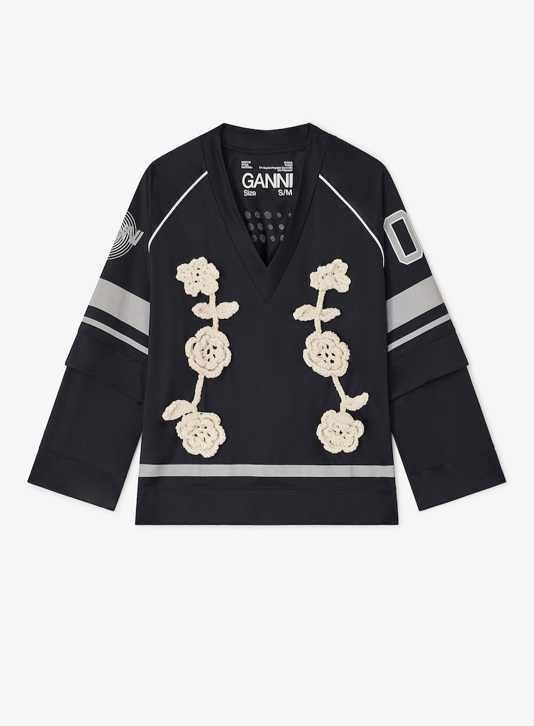 GanniCycora jersey top black €325,00 Incl. btwSize: *S/ML/XLToevoegen aan winkelwagenGratis verzending Vanaf €150,-Beschrijving+ V-neckline + Long sleeves + Flower crochet detailing + Model is 176 cm and wears a size S/M + 70% polyester, 30% recycled polyester (Cycora®)