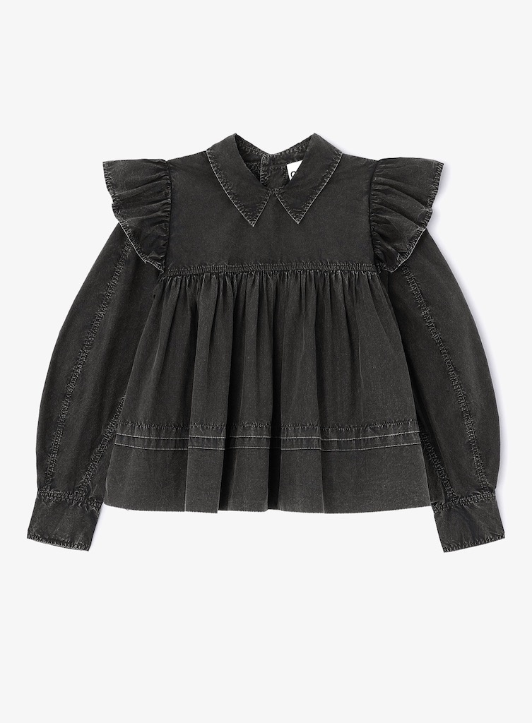 GanniDyed cotton frill blouse black €265,00 Incl. btwSize: *363840Toevoegen aan winkelwagenGratis verzending Vanaf €150,-Beschrijving+ Classic collar + Frill sleeve detail + Ruching + Cuffs + Button closure at back + 100% Organic Cotton