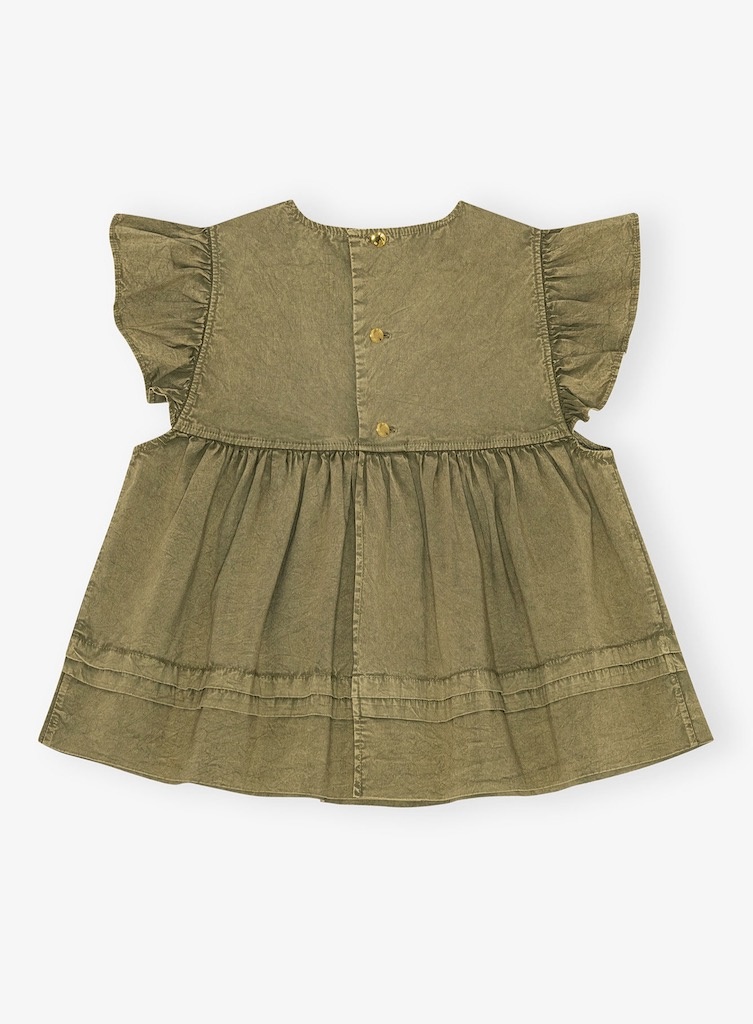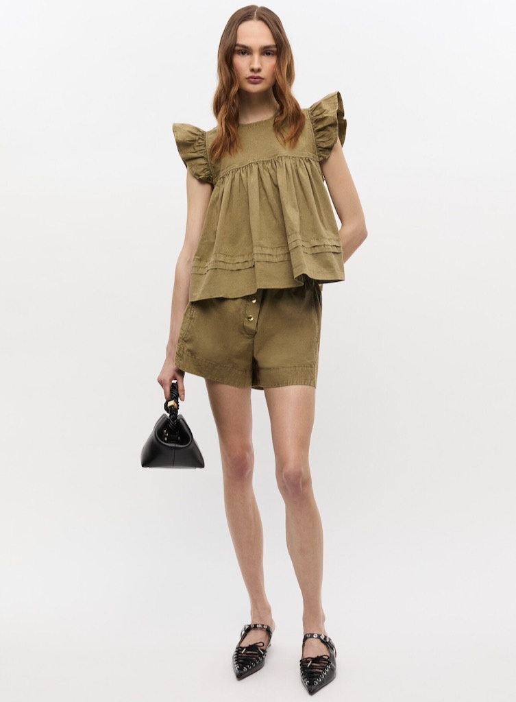 GanniFrill top boa-kaki €225,00 Incl. btwSize: *363840Toevoegen aan winkelwagenGratis verzending Vanaf €150,-Beschrijving+ Washed finish + Round neckline + Short frill sleeves + Pleated hem detailing + 3 button closing at back = 97% organic cotton, 3% elastane