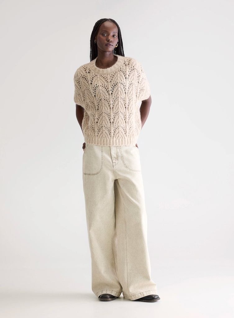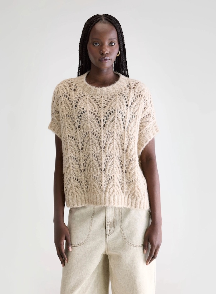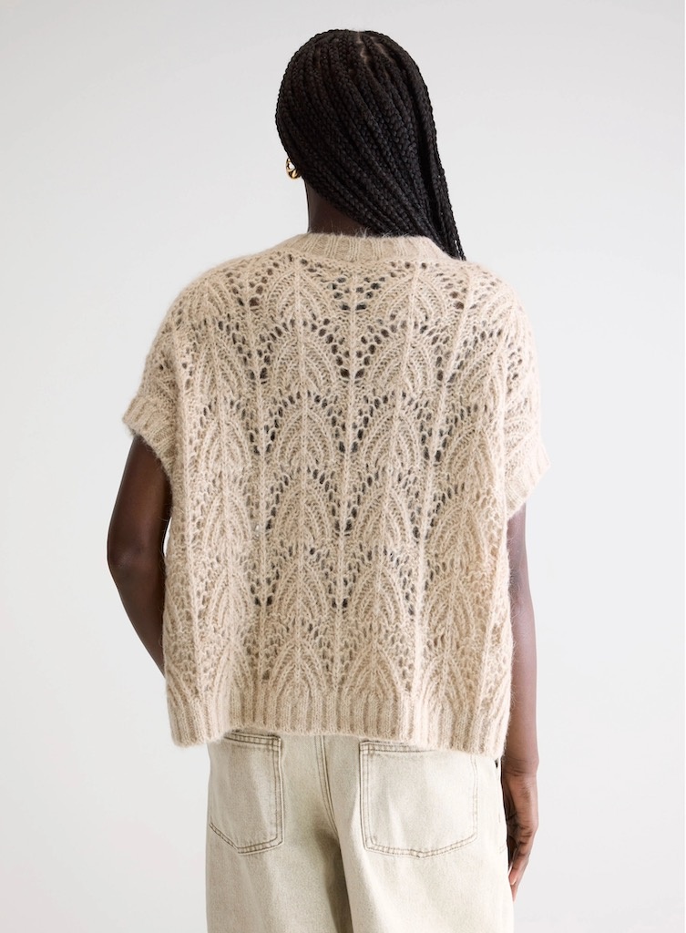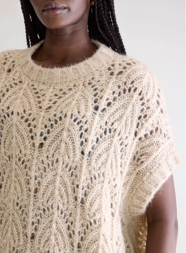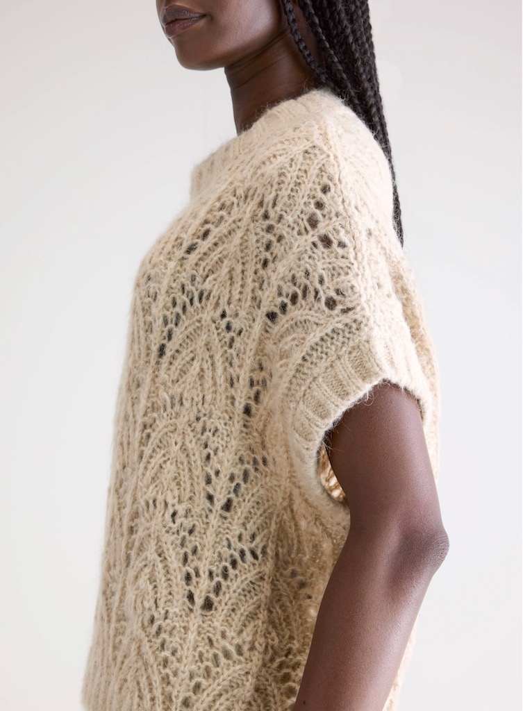 BelleroseNoffy beige spencer €169,00 Incl. btwSize: *S/ML/XLNiet op voorraadGratis verzending Vanaf €150,-Beschrijving+ Oversized fit + Crewneck + Dropped shoulders + Sleeveless + Openwork knit pattern + 43% Acrylic / 30% Polyamide / Nylon / 27% Mohair