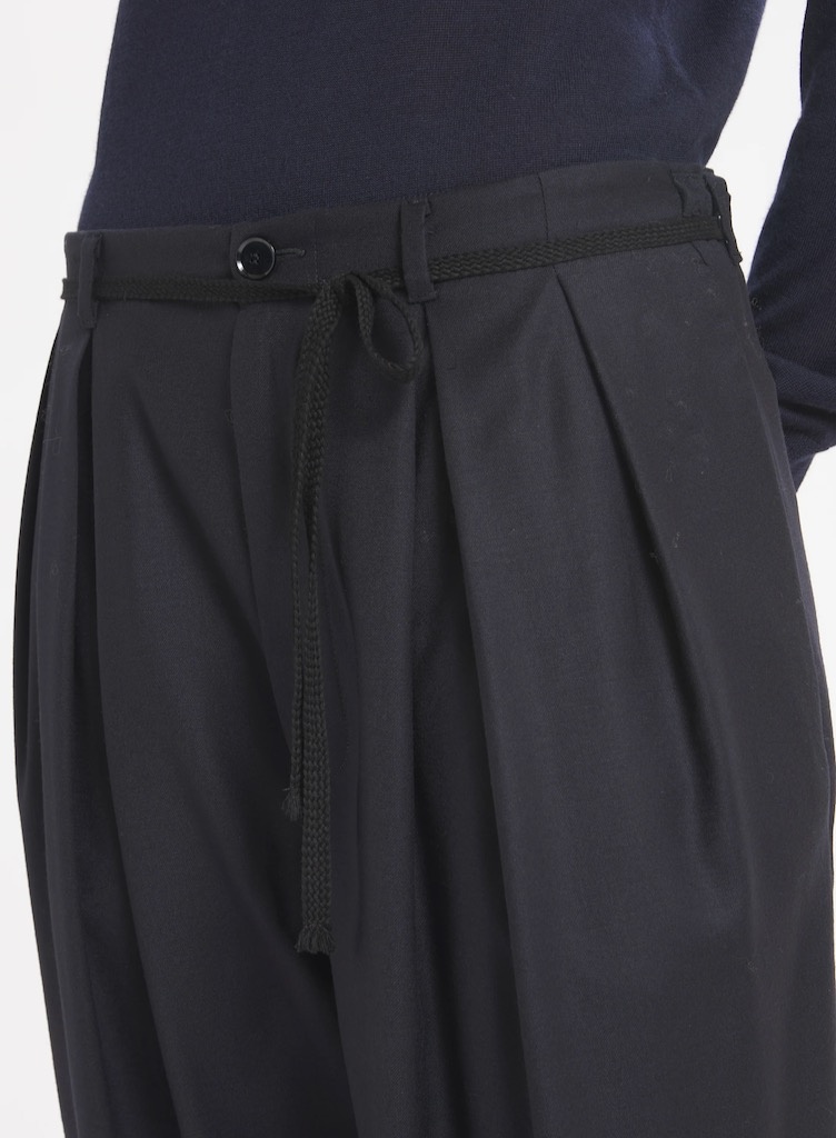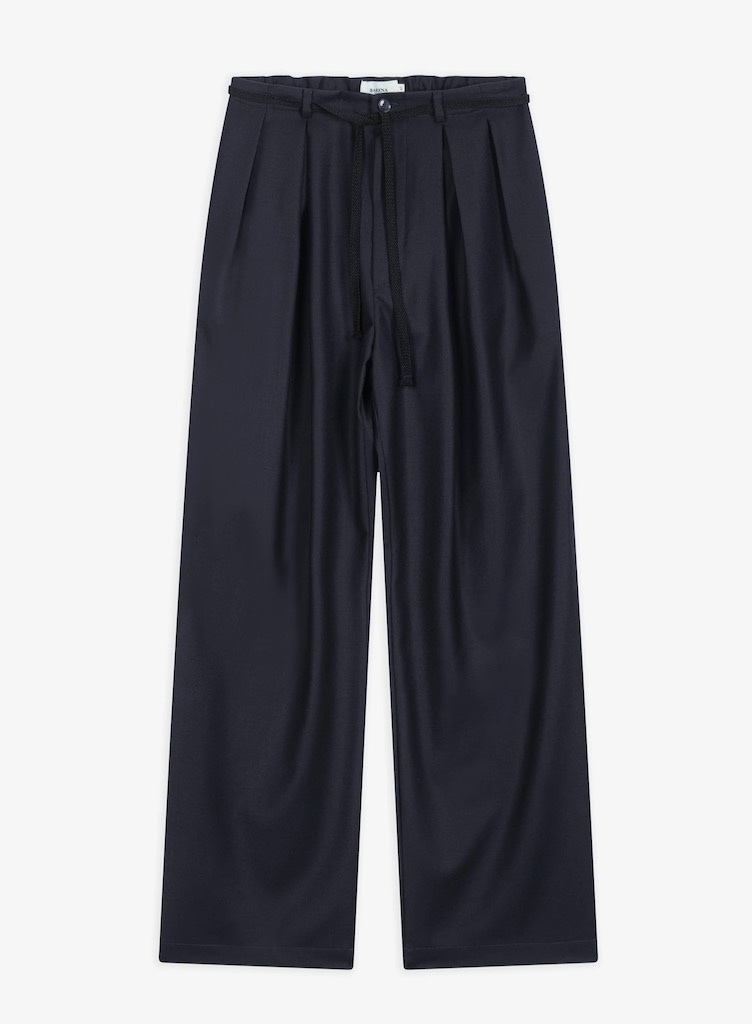 Barena VeneziaPestrin flan pants navy €399,00 Incl. btwSize: *3436384042Toevoegen aan winkelwagenGratis verzending Vanaf €150,-Beschrijving+ Low-rise + Relaxed fit + Side-seam pockets + Full length, wide leg + Double pleats + Belt loops + Zipper fly front with button + Partial elastic waistband on the back + Intertwined black cotton string included + 99% WV 1% EA