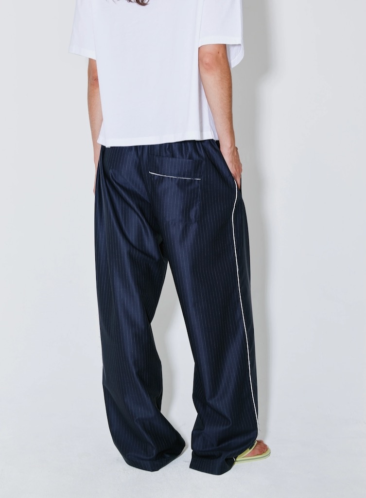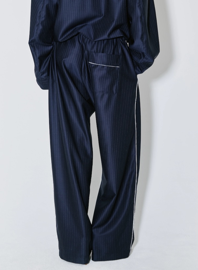 Facon JacminPieter pants navy white stripes €409,00 Incl. btwSize: *363840Toevoegen aan winkelwagenGratis verzending Vanaf €150,-Beschrijving+ Tailored, pyajama-inspired trouser + White pinstripes + Straight, wide leg + Elasticated waist + Contrasting white piping along the side seams + Cut to a fluid, elongated silhouette + Matches with Vittoria jacket + 99% WV 1% CO