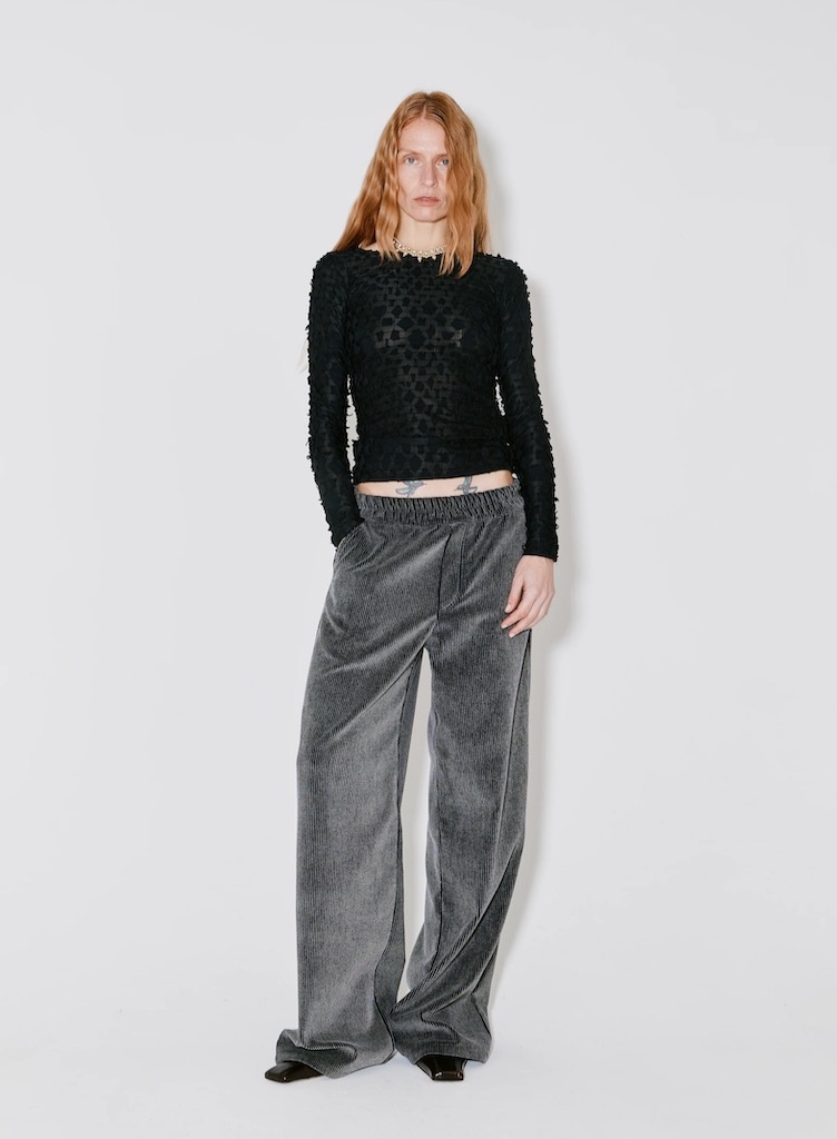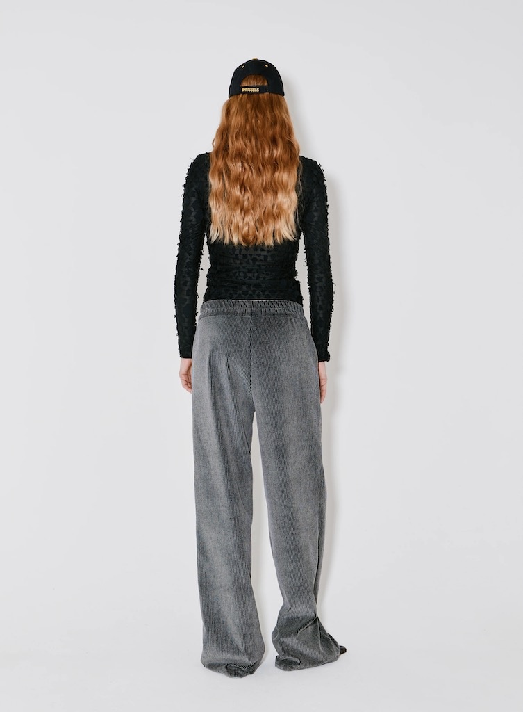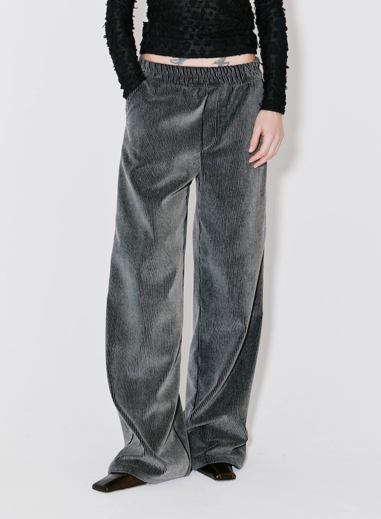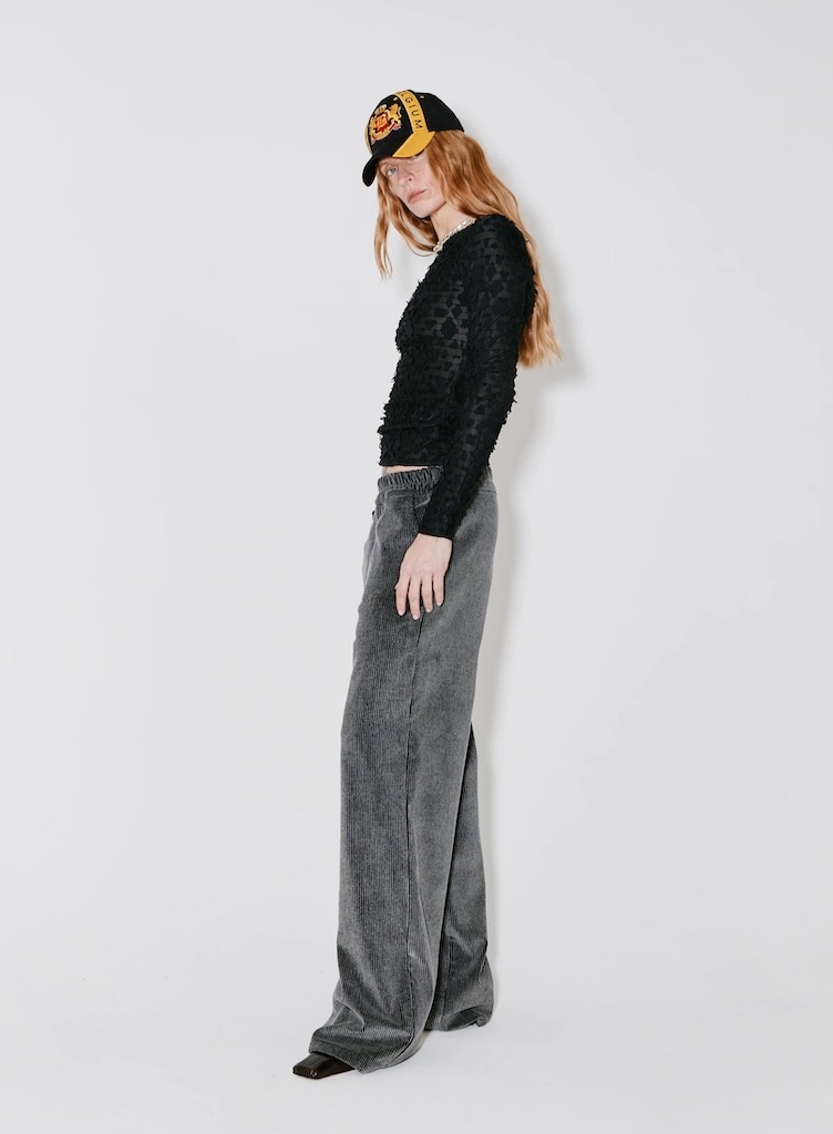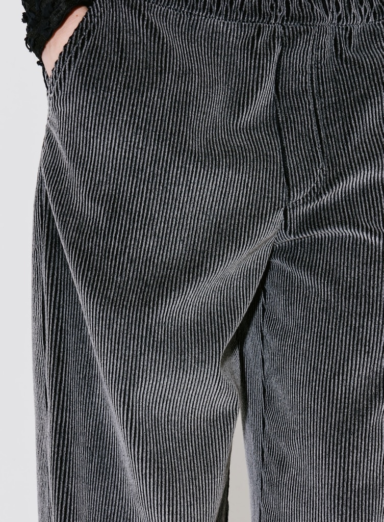 Facon JacminPolly rib grijs €350,00 Incl. btwSize: *SMLXLToevoegen aan winkelwagenGratis verzending Vanaf €150,-Beschrijving+ Wide elastic-waist pants + Dark grey Italian ribbed corduroy + Mid-rise fit + Side seam pockets, + Wide straight leg + 100% Cotton