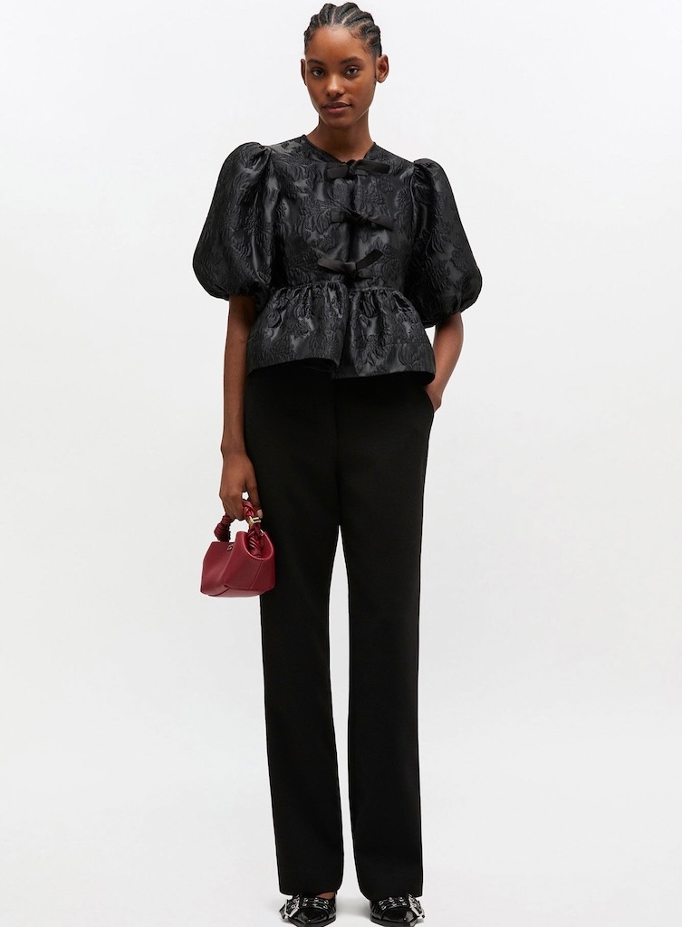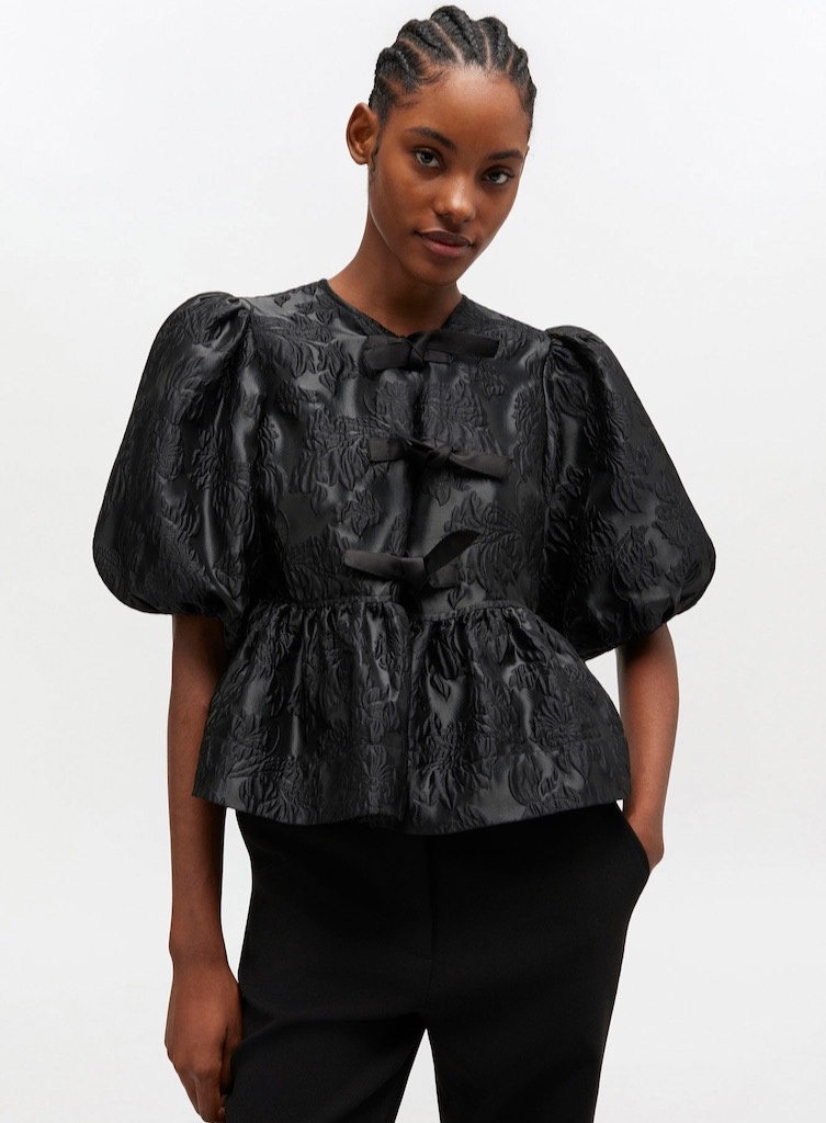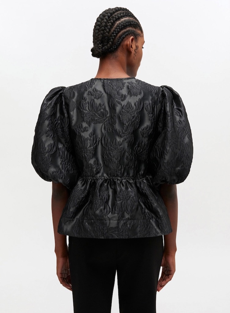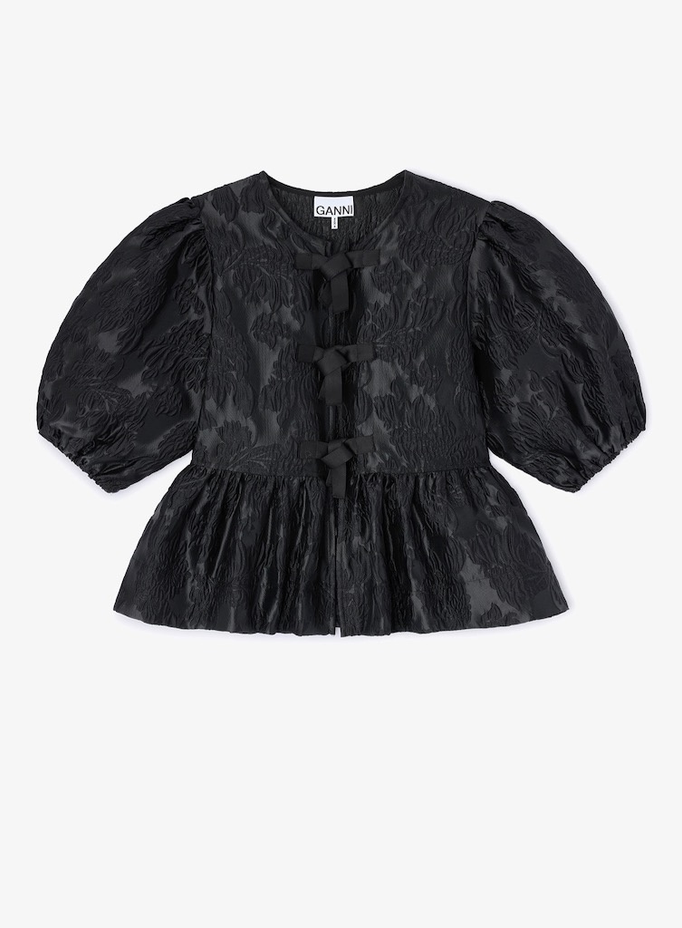 GanniSatin peplum top black €265,00 Incl. btwSize: *34363840Toevoegen aan winkelwagenGratis verzending Vanaf €150,-Beschrijving+Tie closures at the front + Puff sleeves + Model is 180 cm and wears a size 36 + 90% Recycled Polyester, 10% Polyamide