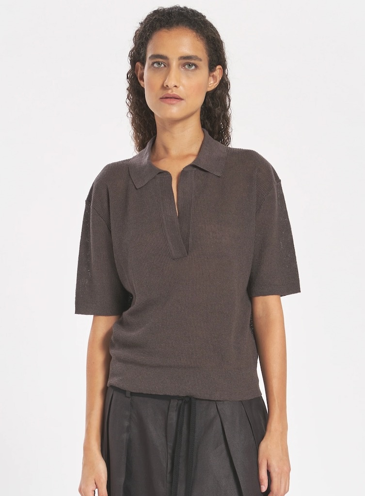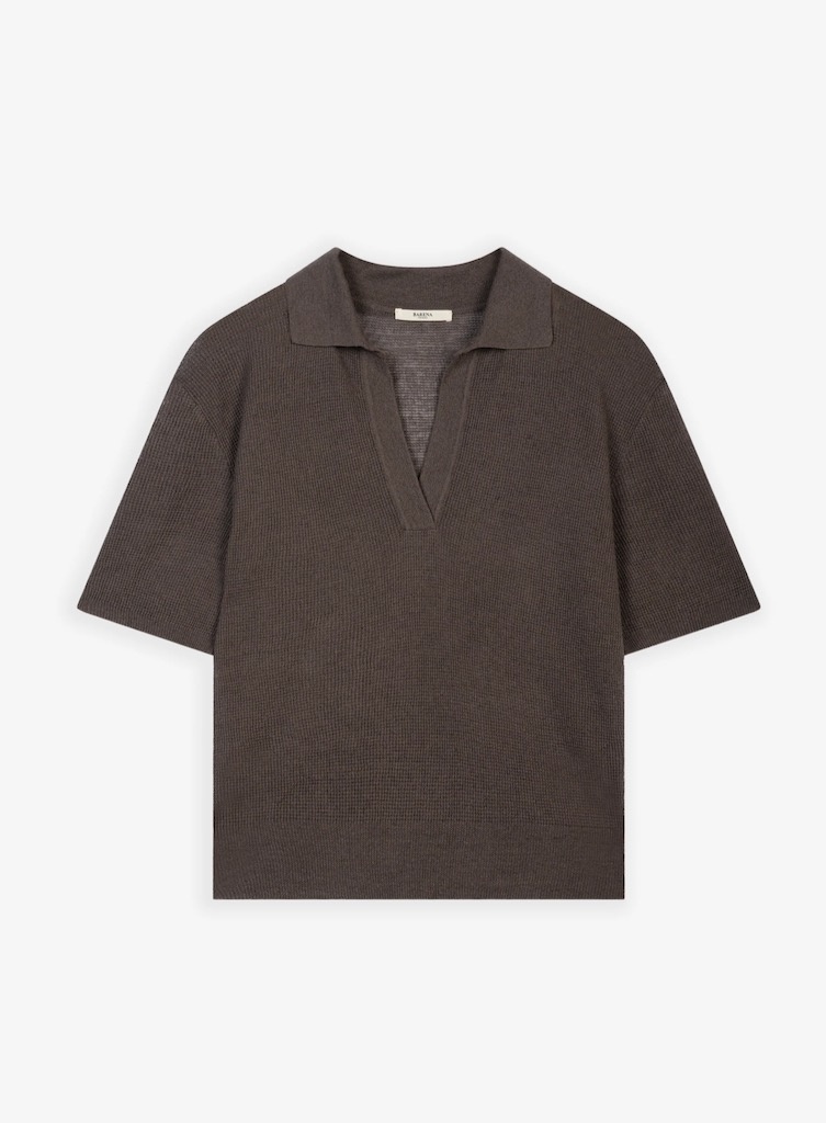 Barena VeneziaVibia knit top noot €329,00 Incl. btwSize: *SMLToevoegen aan winkelwagenGratis verzending Vanaf €150,-Beschrijving+ Relaxed fit + Cropped length + Short sleeves + Polo collar with V-neckline + Ribbed hem + The model is 179 cm and is wearing a size S + 65% LI 35% CO
